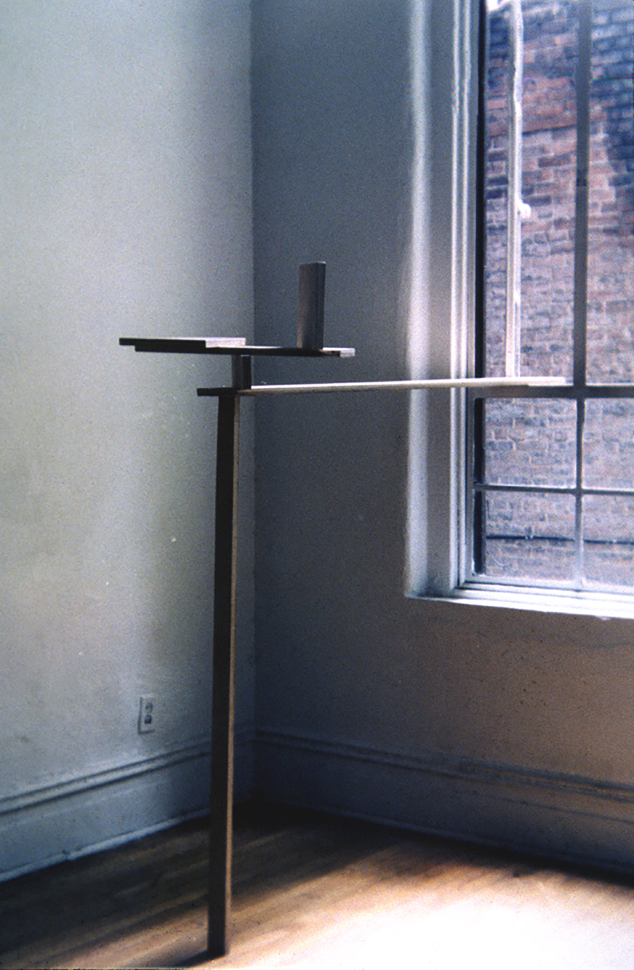 But I was also interested in the absurdity of the act itself – it’s pathetic, as well as intimate quality. It all having something to do with boredom. Besides the actions done outdoors, I began doing equally silly things with stuff around the house: like stacking up chairs with scraps of wood and apples, or a candle on a precarious beam – or constructing an impromptu seat with plywood bits wedged between opposing walls – or steadying a couple of wooden strips on facing chairs, or in the corner of a room, or balancing a trail out the window – or erecting a bridge of books … and snapping a photograph before it all fell down.